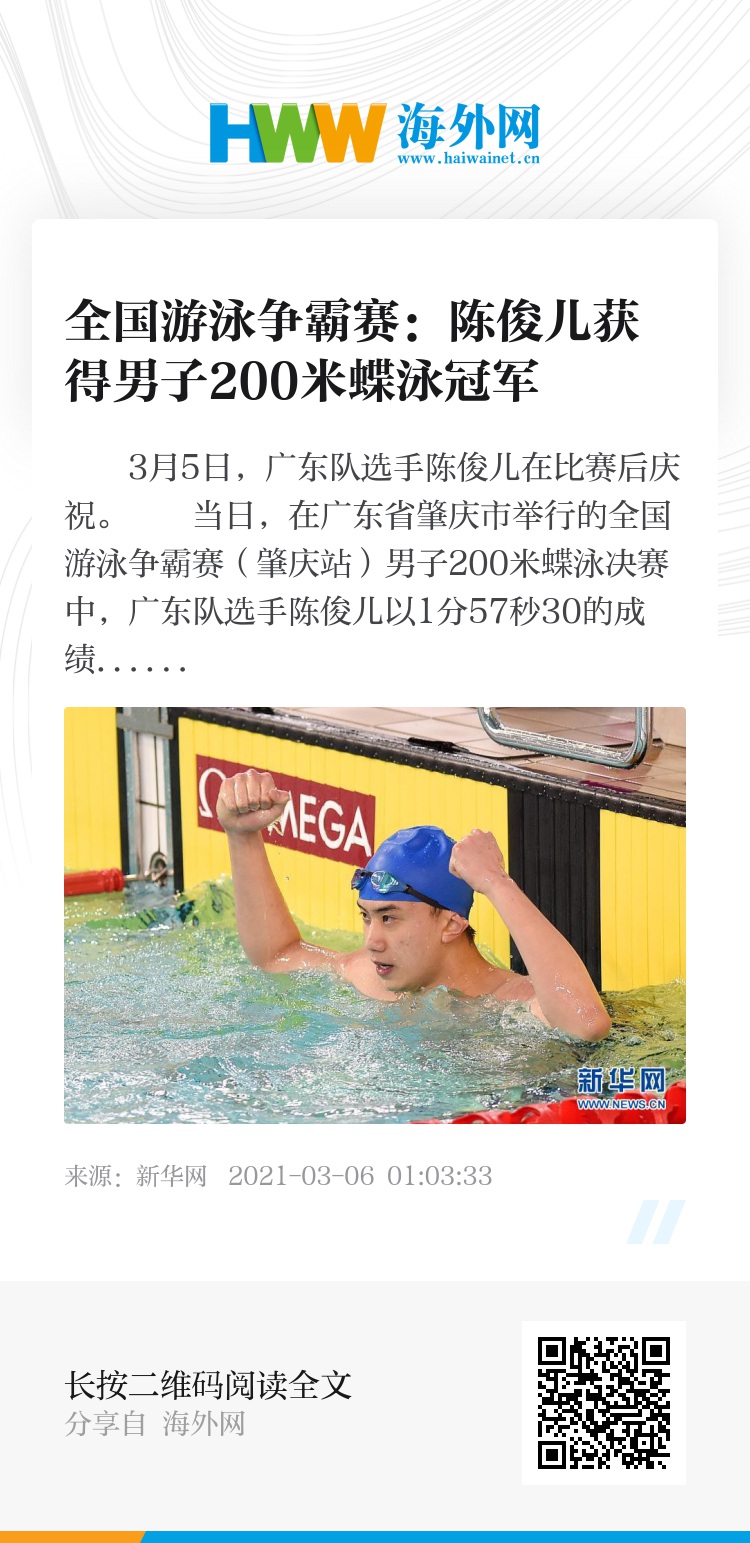 当日,在广东省肇庆市举行的全国游泳争霸赛(肇庆站)男子200米蝶泳决赛中,广东队选手陈俊儿以1分57秒30的成绩夺得冠军。