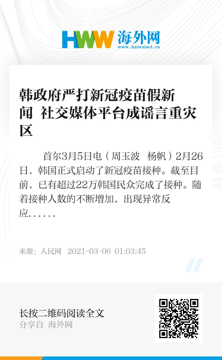 近日,韩国新冠疫情形式仍不乐观,连续多日新增确诊病例都在400名左右。韩国总统文在寅表示,疫苗的接种是生活重回正轨的第一步,只有按计划完成疫苗接种,才能实现“群体免疫”。但是,网上的假新闻会影响民众的判断,弱化民众接种疫苗的意愿。尤其是社交媒体上类似“接种疫苗后流产”的消息被大量转发,成为了谣言重灾区。