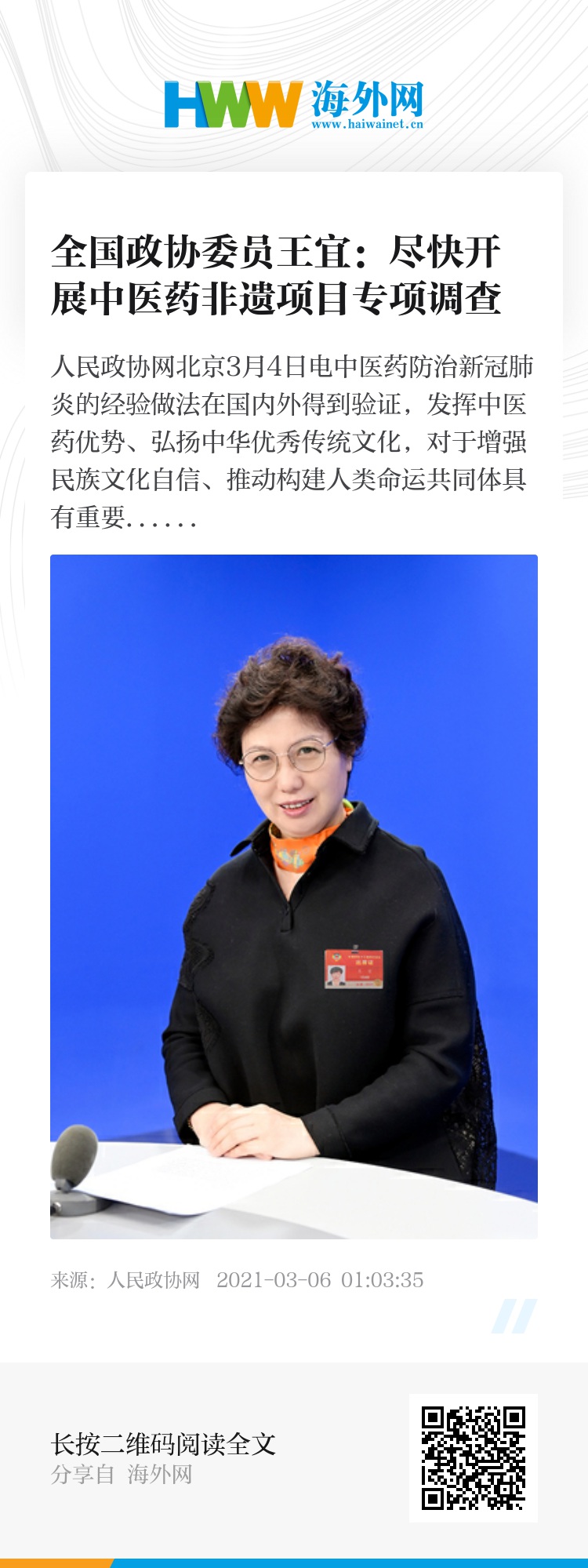 一花独放不是春,百花齐放春满园。“中医药非遗的传承保护,还要在切实解决好明确传承人的体制,职责,权益等问题的同时,重视所涉及的知识产权保护问题。”王宜表示,“解决好中医药优秀资源的活态传承,保护利用,创新发展是一项系统工程,不能单打一,要统筹协调,系统推进,重点突破,离不开政府的重视支持和统筹协调,抓紧抓实、落实落地。希望政府相关部门可以切实加强顶层设计,统筹规划,加强投入。”(文/王珊)