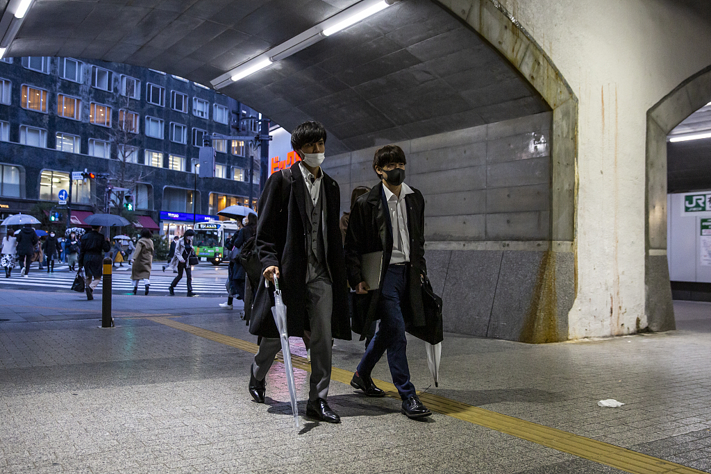 当地时间2021年3月5日,日本东京,市民戴口罩外出。经日本政府对策总部正式决定,由首相菅义伟宣布,将包括东京都、埼玉县、千叶县、神奈川县等在内的一都三县发布的紧急状态,在原定的截止日期3月7日之后,再延长两周至3月21日。图片来源:人民视觉
