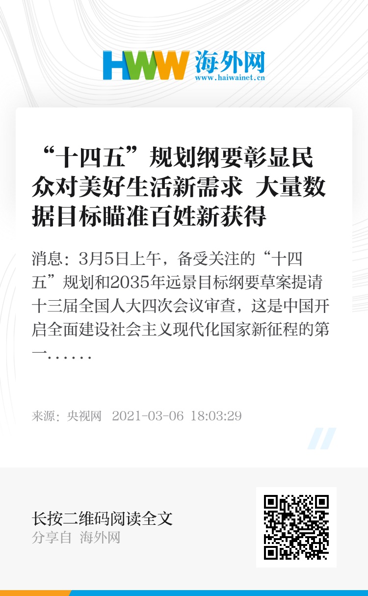 央视网消息:3月5日上午,备受关注的“十四五”规划和2035年远景目标纲要草案提请十三届全国人大四次会议审查,这是中国开启全面建设社会主义现代化国家新征程的第一个5年规划。“十四五”规划纲要草案列出了未来5年经济社会发展20项主要指标,其中涉及民生福祉的就有7项,实现人民对美好生活的向往,是这份纲要草案的主题。“十四五”规划纲要草案在指标设置上就体现了规划的重点与导向,规划纲要草案列出了“十四五”经济社会发展20项主要指标,涉及民生福祉的就有7项,对增进民生福祉,改善人民生活品质提出了一些重要要求和重大举措。