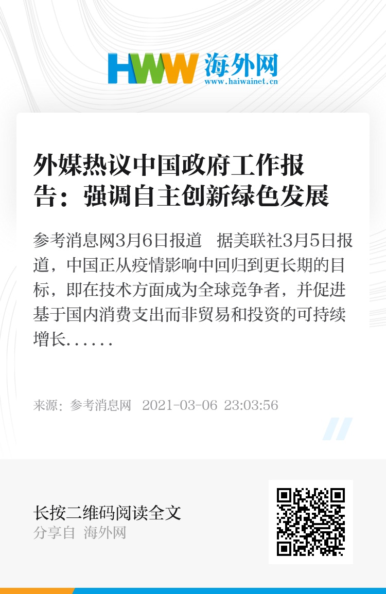 报道表示,在习近平去年宣布中国力争于2030年前二氧化碳排放达到峰值、2060年前实现碳中和后,中国5日承诺将寻求“绿色发展”。这需要大幅增加清洁能源和可再生能源的使用。