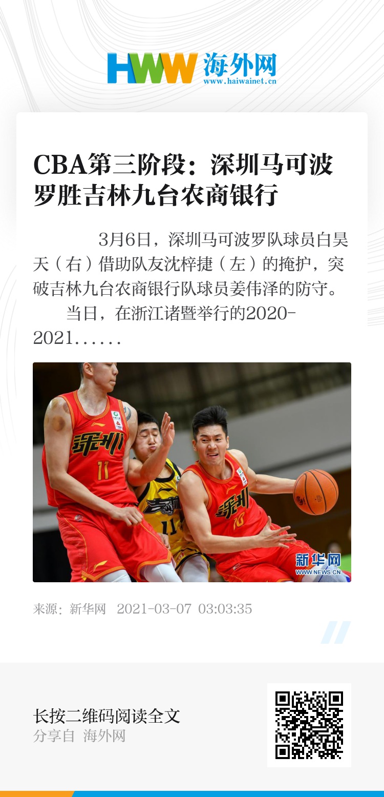 当日,在浙江诸暨举行的2020-2021赛季中国男子篮球职业联赛(CBA)第三阶段第42轮比赛中,深圳马可波罗队以108比96战胜吉林九台农商银行队。
