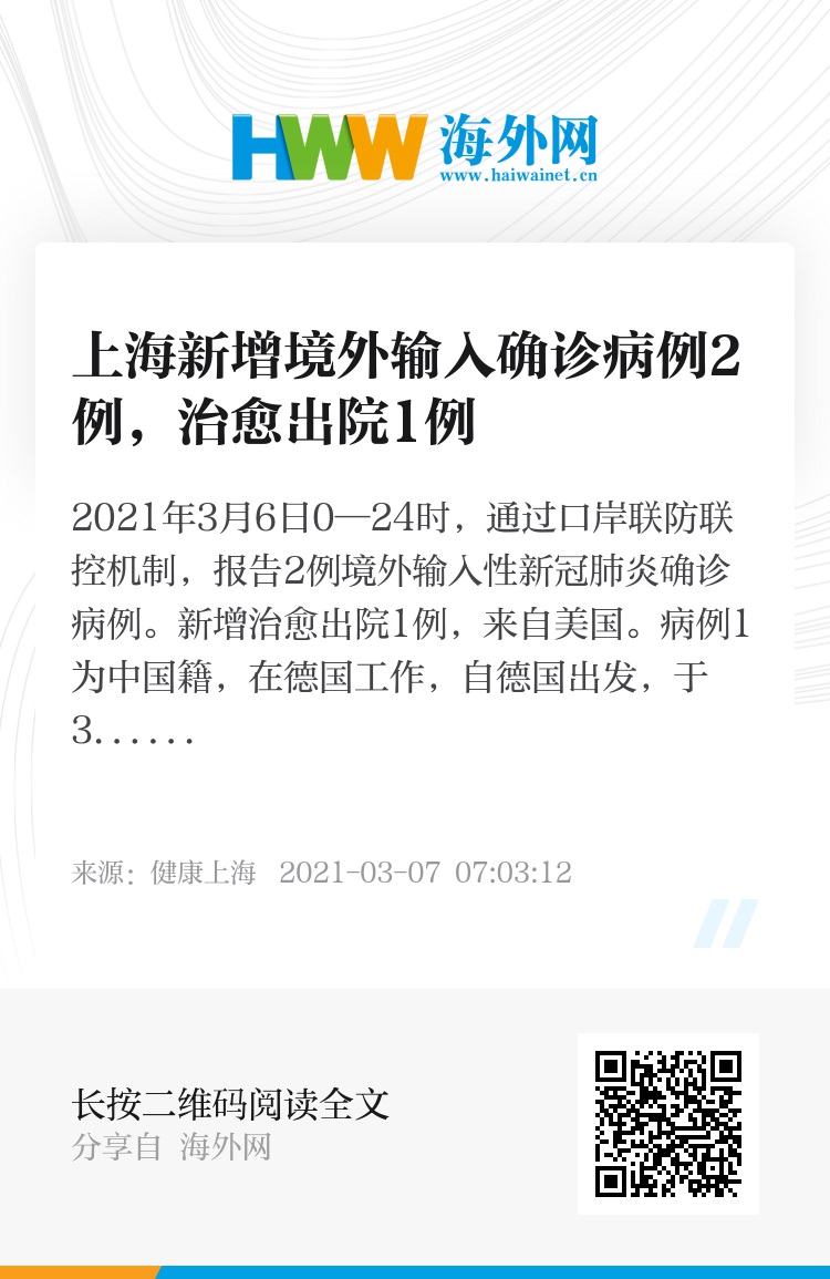 2021年3月6日0—24时,通过口岸联防联控机制,报告2例境外输入性新冠肺炎确诊病例。新增治愈出院1例,来自美国。