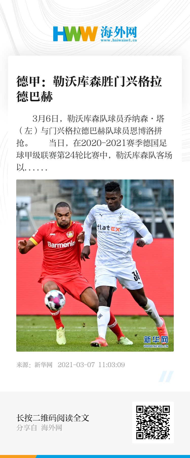当日,在2020-2021赛季德国足球甲级联赛第24轮比赛中,勒沃库森队客场以1比0战胜门兴格拉德巴赫队。新华社发