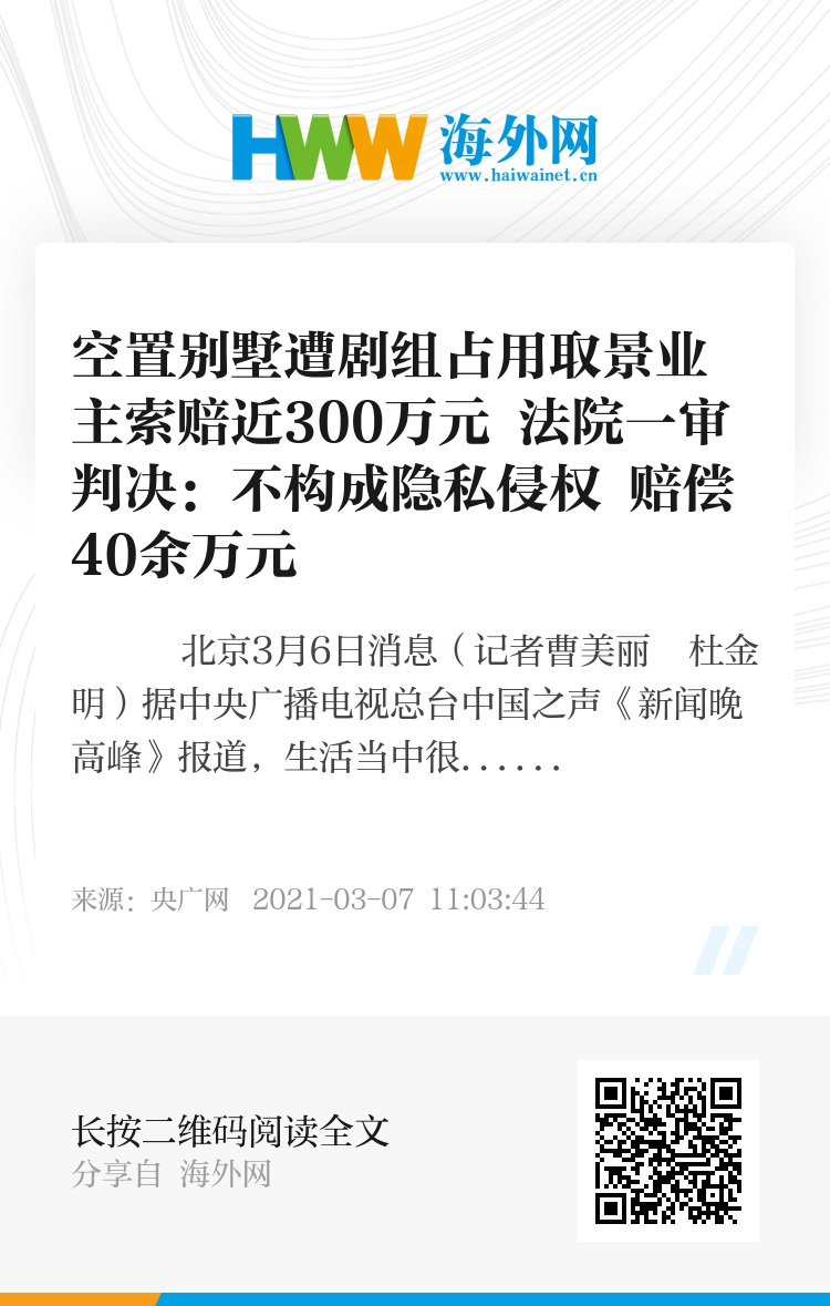 央广网北京3月6日消息(记者曹美丽 杜金明)据中央广播电视总台中国之声《新闻晚高峰》报道,生活当中很多人都有刷剧的习惯,如果您在影视剧当中看到自家的房子,甚至是自己卧室的镜头,您会是什么反应呢?杭州市的戚女士就遇到了这样的事。2019年,她在观看电视剧的时候,发现取景地竟是自己位于宁波一直空置没有入住的别墅,随后她将电视剧出品方、物业公司、播放平台等诉至法院,要求赔偿近300万元。