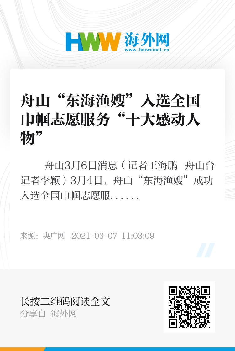 央广网舟山3月6日消息(记者王海鹏 舟山台记者李颖)3月4日,舟山“东海渔嫂”成功入选全国巾帼志愿服务“十大感动人物”。多年来,这支由渔嫂组成的志愿者队伍,以渔农民喜闻乐见的方式开展了一场又一场志愿服务活动,深受当地群众喜爱。