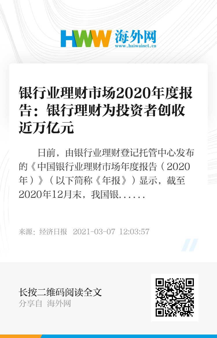 日前,由银行业理财登记托管中心发布的《中国银行业理财市场年度报告(2020年)》(以下简称《年报》)显示,截至2020年12月末,我国银行理财市场规模达25.86万亿元,同比增长6.90%;当年累计为投资者创造收益9932.5亿元,同比增长7.13%。与此同时,银行理财产品通过投资债券、非标准化债权、未上市股权等资产,实现了理财资金与实体经济融资需求的对接。截至2020年12月末,支持实体经济资金规模达22.21万亿元。