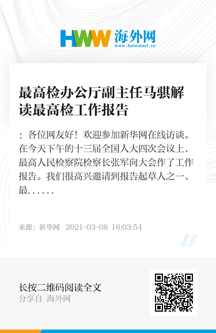 新华网:各位网友好!欢迎参加新华网在线访谈。在今天下午的十三届全国人大四次会议上,最高人民检察院检察长张军向大会作了工作报告。我们很高兴邀请到报告起草人之一、最高人民检察院办公厅副主任马骐,为各位网友解读最高检工作报告。马主任是首次做客新华网,先向网友们打个招呼吧。
