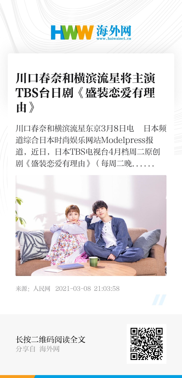 人民网东京3月8日电 日本频道综合日本时尚娱乐网站Modelpress报道,近日,日本TBS电视台4月档周二原创剧《盛装恋爱有理由》(每周二晚10点播出)公布了演员名单。川口春奈是首次主演TBS台的周二剧,横滨流星是继电视剧《初恋那一天所读的故事》后,时隔两年再次出演TBS台的周二剧,两人将展开一场“心动”的爱情故事。