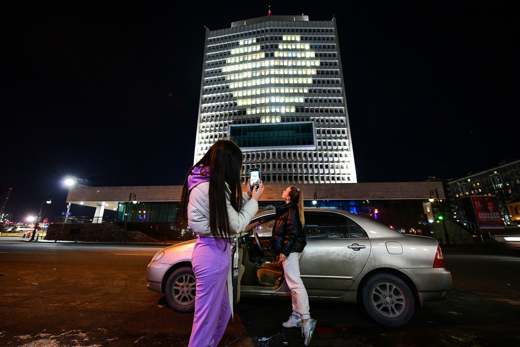 当地时间2021年3月7日,俄罗斯符拉迪沃斯托克,当地大楼点亮心形图案,庆祝即将到来的国际妇女节。图片来源: IC photo