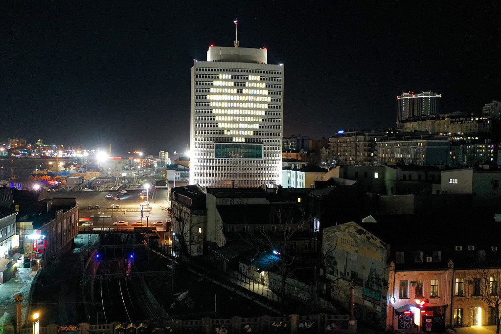 当地时间2021年3月7日,俄罗斯符拉迪沃斯托克,当地大楼点亮心形图案,庆祝即将到来的国际妇女节。图片来源: IC photo