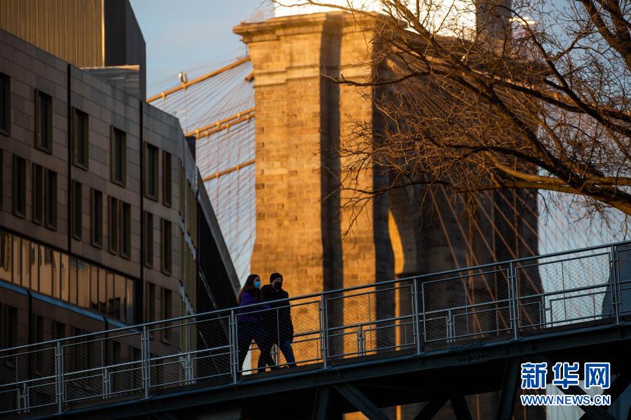 3月8日,美国纽约的行人从布鲁克林大桥附近的一处天桥上通过。新华社发(郭克摄)