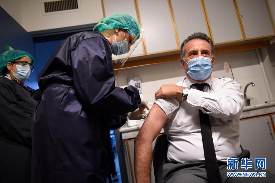 3月8日,乌拉圭公共卫生部长丹尼尔·萨利纳斯(右)在蒙得维的亚接种中国科兴新冠疫苗。新华社发(尼古拉斯·塞拉亚摄)