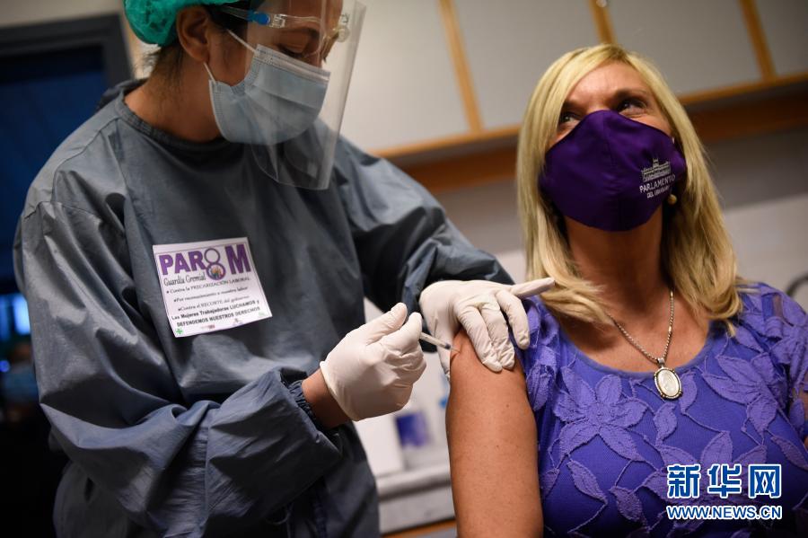 3月8日,乌拉圭副总统阿希蒙(右)在蒙得维的亚接种中国科兴新冠疫苗。乌拉圭副总统阿希蒙和公共卫生部长丹尼尔·萨利纳斯8日在首都蒙得维的亚的一所医院接种了中国科兴公司研制的新冠疫苗。新华社发(尼古拉斯·塞拉亚摄)