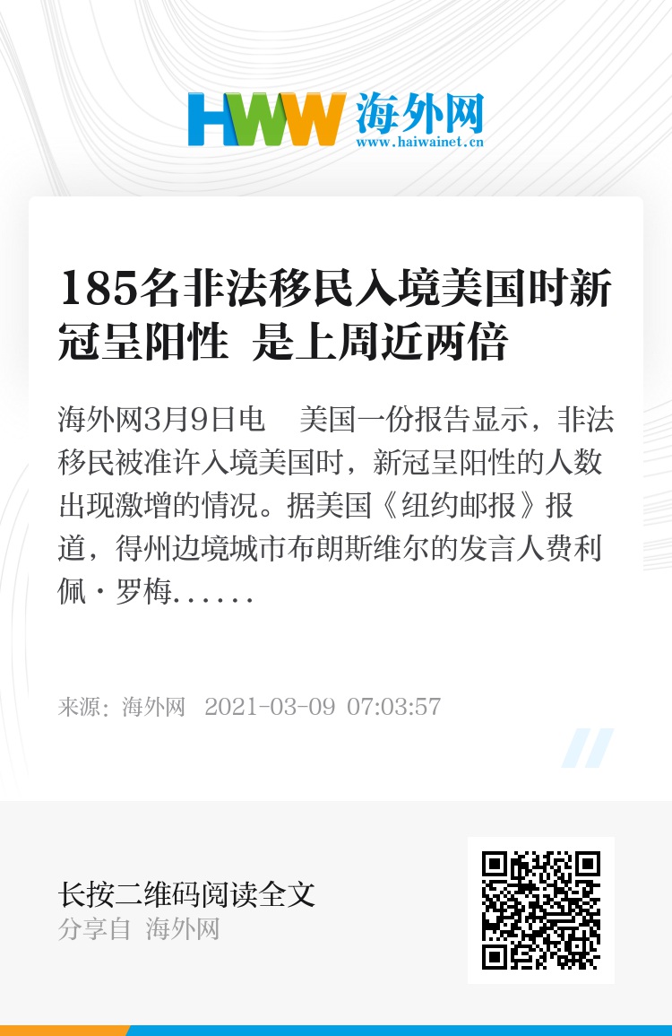 据美国《纽约邮报》报道,得州边境城市布朗斯维尔的发言人费利佩·罗梅罗8日表示,在汽车站进行的快速检测中,有185名移民新冠检测呈阳性,这一数据是上周(108人)的近两倍。自1月25日以来,在穿过美国边境时新冠呈阳性的人数已经达到1553人。
