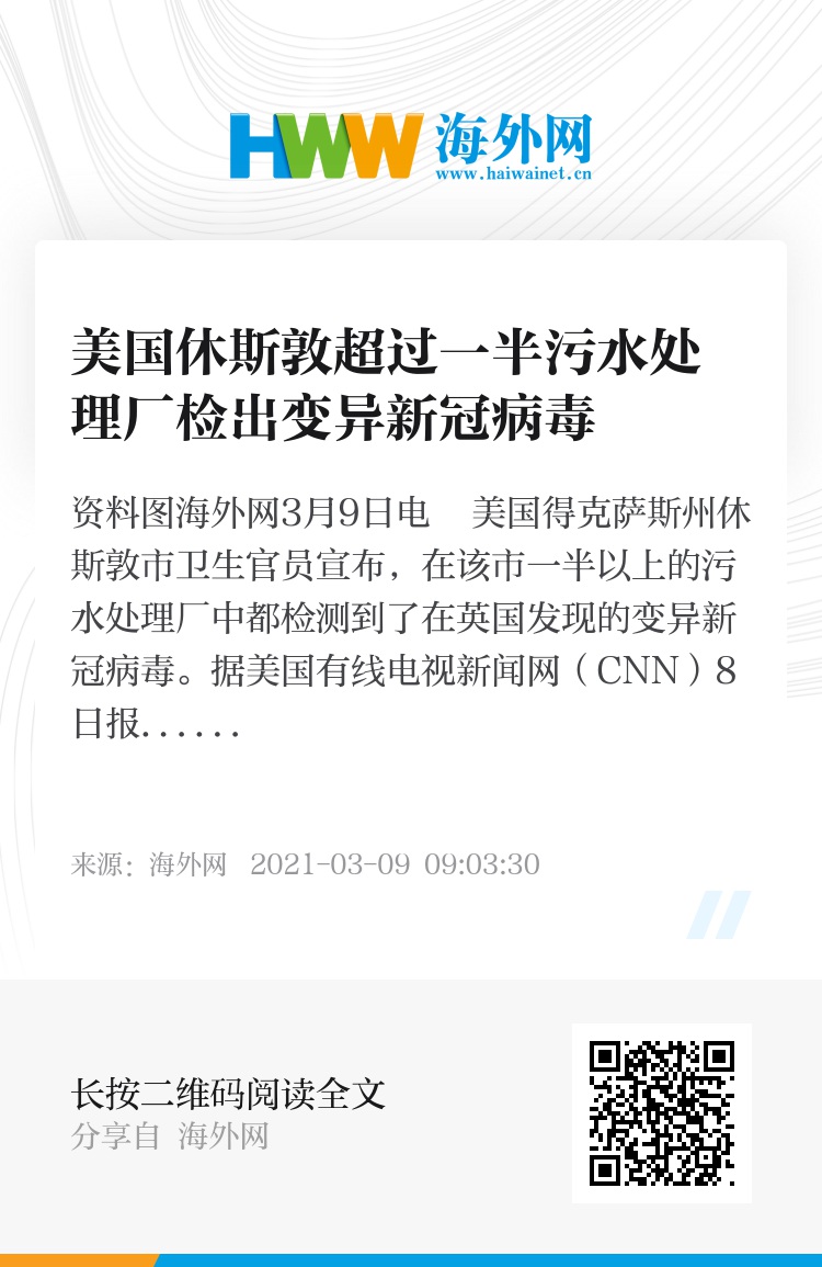 海外网3月9日电 美国得克萨斯州休斯敦市卫生官员宣布,在该市一半以上的污水处理厂中都检测到了在英国发现的变异新冠病毒。