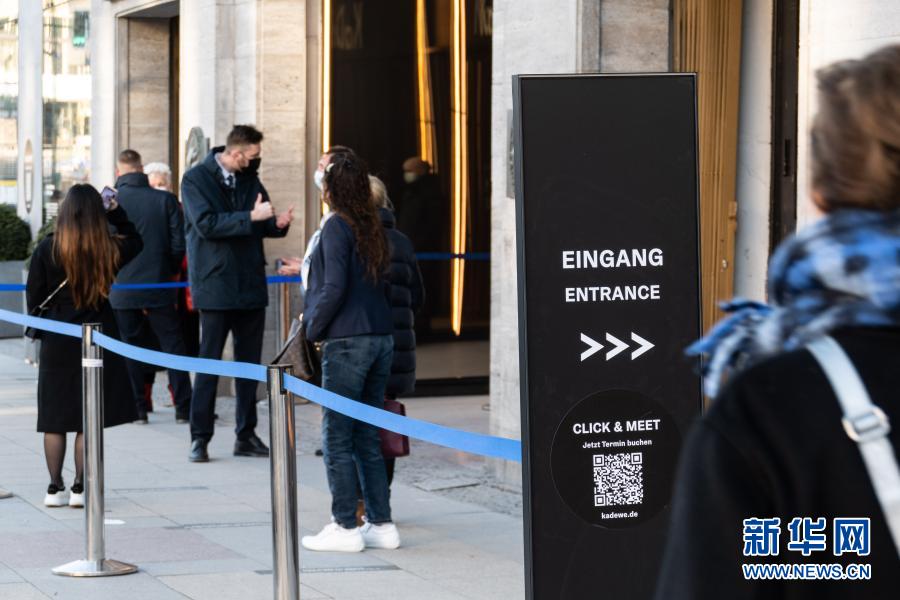 3月9日,人们在德国首都柏林排队等候进入一家商店。柏林部分非必需日用品零售商店在遵守防疫规定、限制客流等条件下恢复营业。新华社发(斯特凡·蔡茨摄)