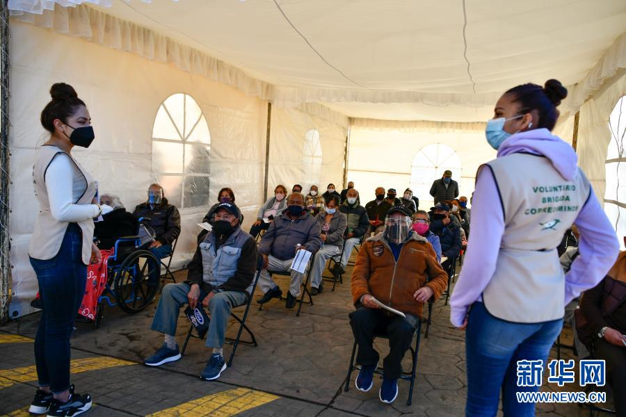 3月9日,人们在墨西哥伊达尔戈州阿卡克索奇特兰一处新冠疫苗接种点等待。墨西哥伊达尔戈州小城阿卡克索奇特兰9日开始接种中国科兴新冠疫苗,当地首批接种人群为60岁及以上的老年人。新华社记者 辛悦卫 摄