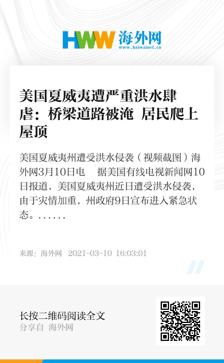 海外网3月10日电 据美国有线电视新闻网10日报道,美国夏威夷州近日遭受洪水侵袭,由于灾情加重,州政府9日宣布进入紧急状态。洪水来势汹汹,毛伊岛至少六十所房屋遭到严重破坏,多处桥梁道路被淹没。毛伊县县长表示,这是25年来最严重的洪水,一直担心水坝溃堤,要求下游居民撤离。