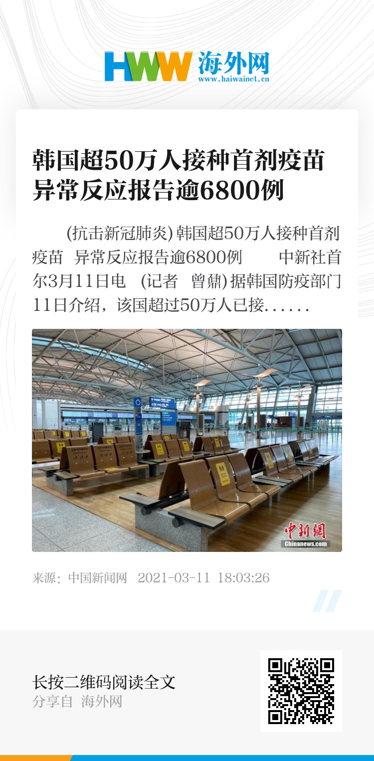中新社首尔3月11日电 (记者 曾鼐)据韩国防疫部门11日介绍,该国超过50万人已接种第一剂新冠疫苗,累计收到超过6800例异常反应报告。