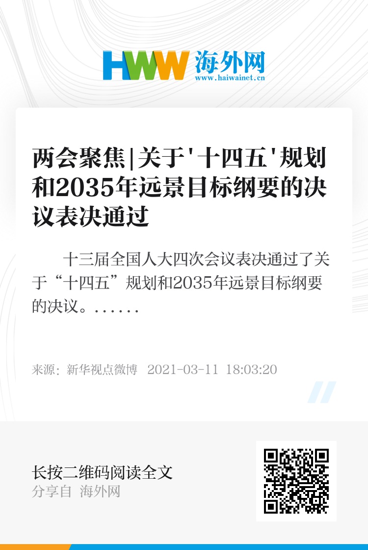 十三届全国人大四次会议表决通过了关于“十四五”规划和2035年远景目标纲要的决议。
