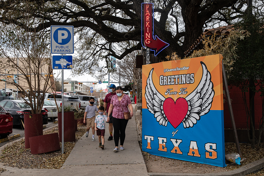 美国得克萨斯州于当地时间10日起重启经济,并取消“强制佩戴口罩”等防疫令。不过,由于得州目前疫情形势依旧严峻,这引发了不少人的不满和担忧。图源:人民视觉/视觉中国