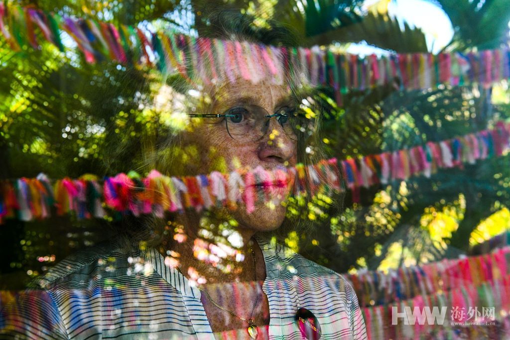 3月10日讯,美国佛罗里达州安娜玛丽亚岛,67岁的凯西·托拜厄斯(Cathy Tobias)在院子里系上丝带,纪念新冠肺炎遇难者。(供图:视觉中国)