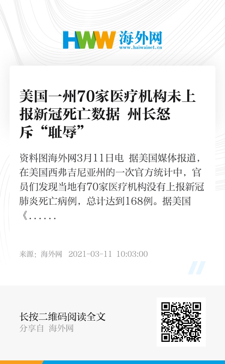 海外网3月11日电 据美国媒体报道,在美国西弗吉尼亚州的一次官方统计中,官员们发现当地有70家医疗机构没有上报新冠肺炎死亡病例,总计达到168例。