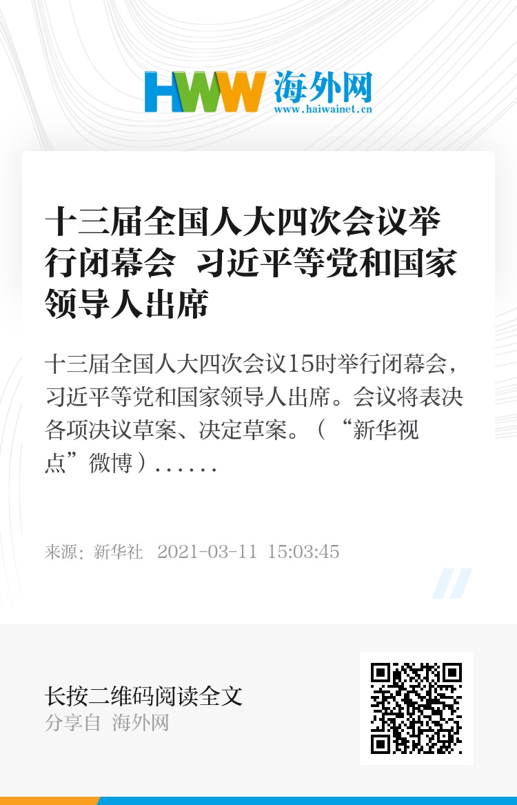 十三届全国人大四次会议15时举行闭幕会,习近平等党和国家领导人出席。会议将表决各项决议草案、决定草案。(