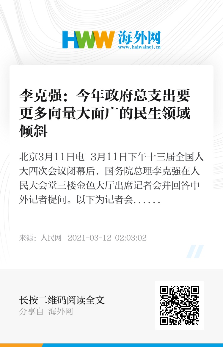 李克强:今年政府总支出比去年略有增加,盘子不小,所以要更多地向量大面广的民生领域倾斜,特别是义务教育和基本医疗。如果下半年经济持续向好,那么会下更大的力度把财政支出,包括债务支出投向这些领域。这对拉动当年GDP增长可能不明显,但是对于长远发展、惠民生有支撑作用。我们要坚持以人民为中心的发展思想,这是习近平新时代中国特色社会主义思想的重要内容,人民的政府就应当以民之所望为施政所向。