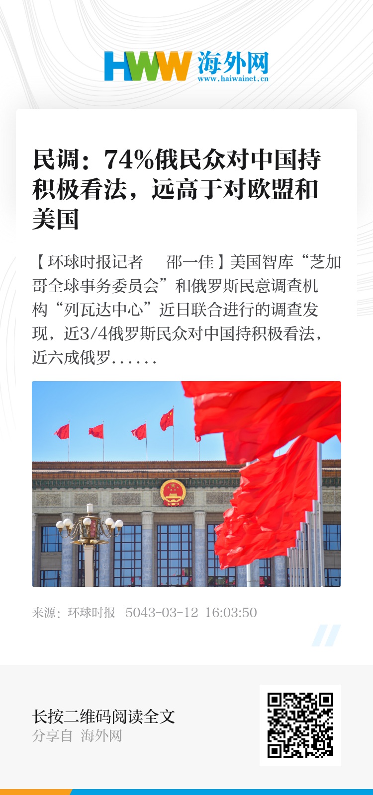 这项调查在今年1月29日至2月2日间进行,涵盖俄罗斯50个地区的城市和农村,共1616名成年人。芝加哥全球事务委员会官网10日发布的调查报告显示,74%的俄罗斯人对中国持积极看法,远高于对欧盟(45%)和美国(39%)持积极看法的比例。