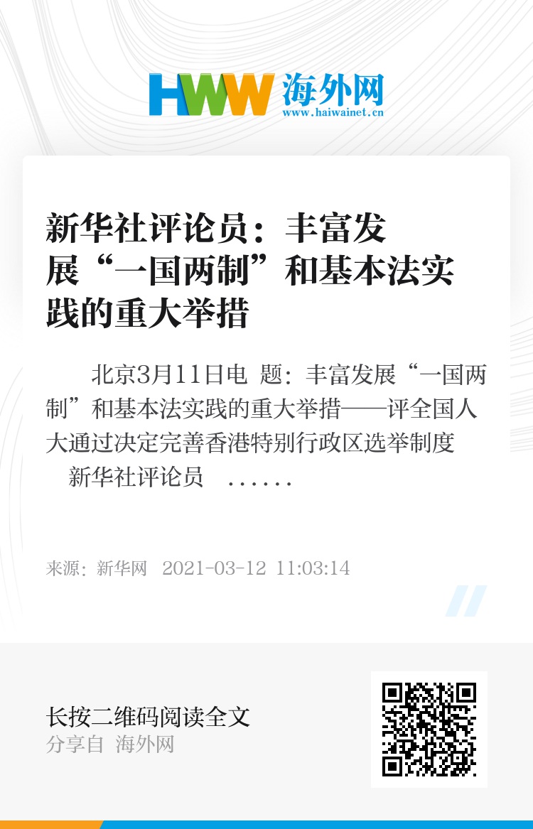 新华社北京3月11日电 题:丰富发展“一国两制”和基本法实践的重大举措——评全国人大通过决定完善香港特别行政区选举制度