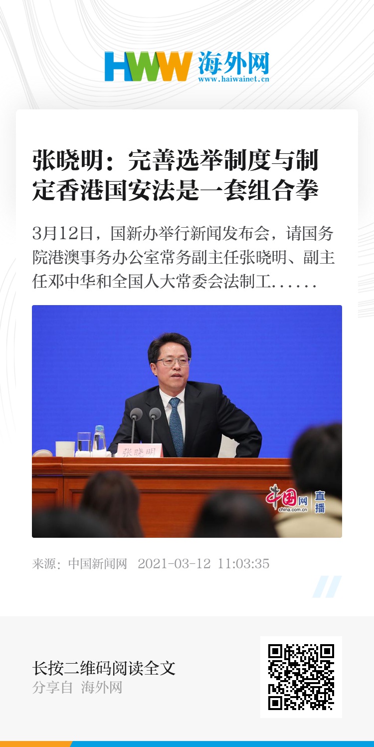 张晓明:连日来,香港特区行政区政府和社会各界人士通过发表声明、接受访谈、联署签名和在街头摆街站等方式来表达他们对全国人大有关决定的坚定支持。根据香港研究协会的民调,约7成受访者表示支持全国人大的决定。这是对国际上的一些诬蔑不实之词最好的、最有力的回应。去年香港国安法颁布的时候,我也在这个地方讲过一句形容的话,就是“一法安香江”。今天我想再加一句话,连成个对,也是好事成双,“一法霹雳安香江,选规厘定护远航。”选举制度、选举规矩进一步修正了、理顺了,可以确保“一国两制”的“香港号”这艘航船破浪远航,香港的明天也一定会更加美好。