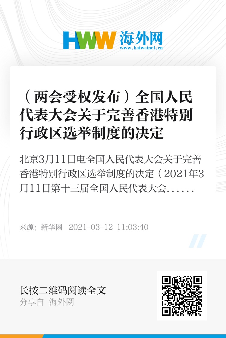 第十三届全国人民代表大会第四次会议审议了全国人民代表大会常务委员会关于提请审议《全国人民代表大会关于完善香港特别行政区选举制度的决定(草案)》的议案。会议认为,香港回归祖国后,重新纳入国家治理体系,《中华人民共和国宪法》和《中华人民共和国香港特别行政区基本法》共同构成香港特别行政区的宪制基础。香港特别行政区实行的选举制度,包括行政长官和立法会的产生办法,是香港特别行政区政治体制的重要组成部分,应当符合“一国两制”方针,符合香港特别行政区实际情况,确保爱国爱港者治港,有利于维护国家主权、安全、发展利益,保持香港长期繁荣稳定。为完善香港特别行政区选举制度,发展适合香港特别行政区实际情况的民主制度,根据《中华人民共和国宪法》第三十一条和第六十二条第二项、第十四项、第十六项的规定,以及《中华人民共和国香港特别行政区基本法》、《中华人民共和国香港特别行政区维护国家安全法》的有关规定,全国人民代表大会作出如下决定: