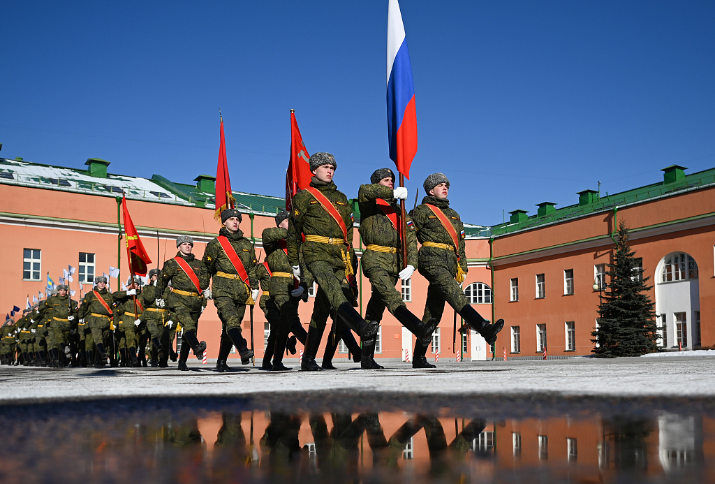 ​当地时间3月11日,俄罗斯士兵参加阅兵式彩排,该阅兵式为纪念第二次世界大战胜利76周年。图片来源:视觉中国