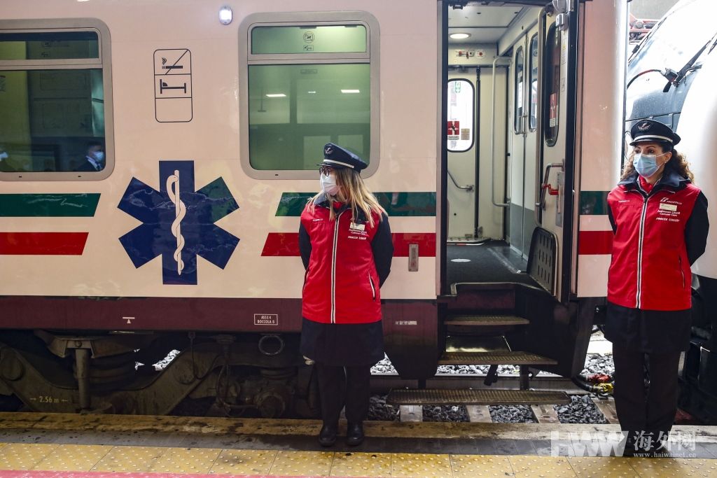 为应对持续激增的新冠肺炎患者,意大利特别开通一辆铁路医疗专列,用于在医院人满为患时转运全国各地的新冠患者。据媒体2021年3月11日报道,这辆列车共有8节车厢,拥有21张重症监护病床,配有呼吸机、氧气瓶等其他医疗设备,可搭载45名医生和护士。报道称,这辆医疗专列将以伦巴第大区的米兰中央火车站作为接收新冠肺炎患者的基地。该列车上的一名护士在接受采访时表示,每节车厢的病人将由至少5名专业人员组成的医疗团队负责医治。(供图:澎湃影像)