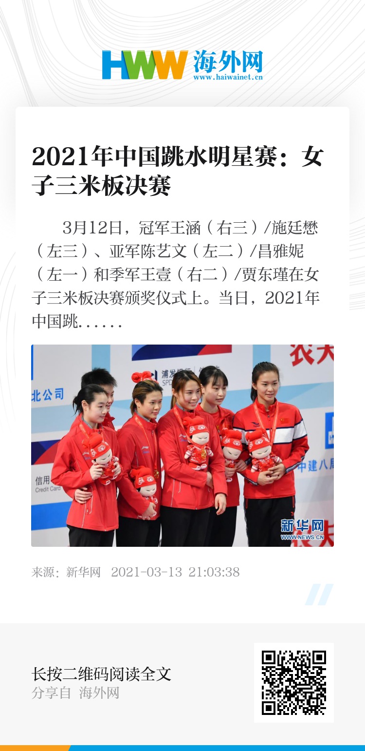 3月12日,王壹/贾东瑾(右)在比赛中。当日,2021年中国跳水明星赛暨第十四届全运会跳水测试赛在西安奥体中心游泳跳水馆开赛。在女子双人三米板决赛中,河北209队王涵/重庆队施廷懋组合以340.8分的总成绩夺得冠军,广东印海队陈艺文/湖北浩沙队昌雅妮组合与陕西浩沙队王壹/贾东瑾组合分别以320.82分和298.80分的总成绩获得亚、季军。新华社记者 张博文 摄