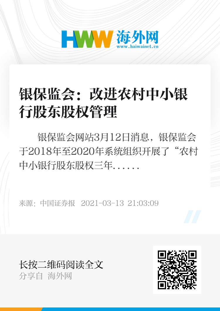 银保监会网站3月12日消息,银保监会于2018年至2020年系统组织开展了“农村中小银行股东股权三年排查整治行动”。三年来,3898家农村中小银行全部完成了机构自查和监管检查,实现了排查整治全覆盖的工作目标。