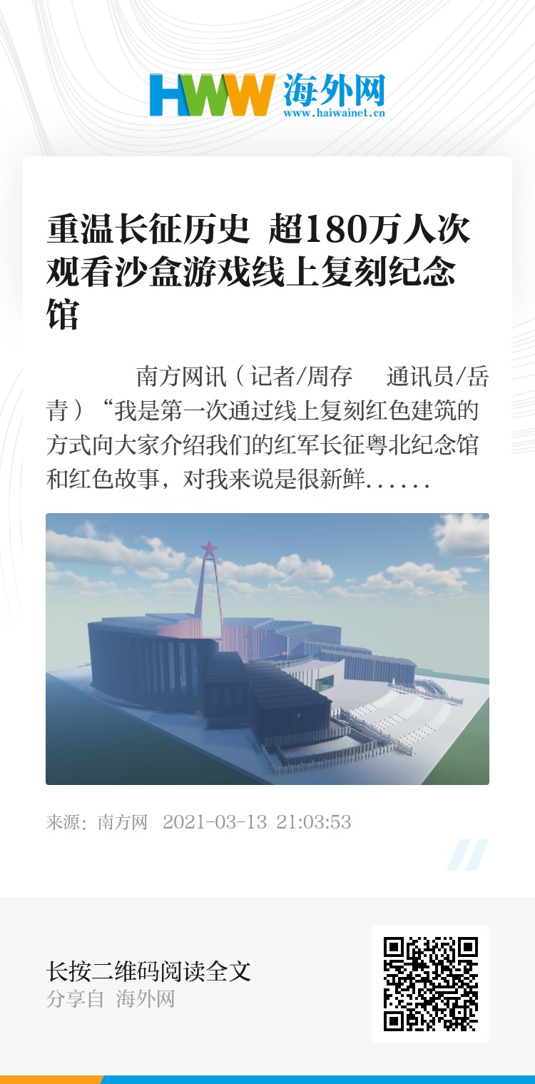 作为纪念馆沙盒游戏线上复刻者虎牙主播羌熙提到,“这是我第一次用沙盒游戏来复刻红色建筑,在复刻过中透过红色建筑重温历史足迹,老一辈红军精神依然激励我们这一代年轻人勇往前行。”