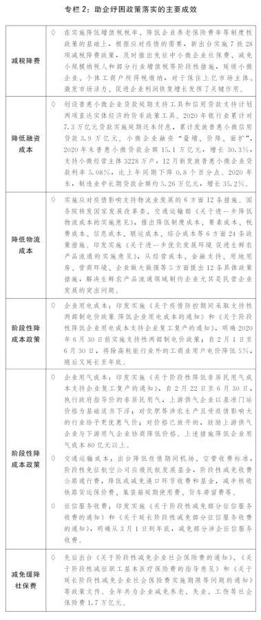 二是助企纾困政策有效实施。减税降费红利深度释放,实施阶段性大规模减税降费,阶段性减免小规模纳税人增值税,阶段性减免养老、失业、工伤三项社会保险单位缴费部分,减半征收职工医疗保险单位缴费部分,落实住房公积金阶段性支持政策,全年为市场主体减负超过2.6万亿元。创新宏观政策实施方式,中央财政对新增2万亿元资金建立直达机制,省级财政加大资金下沉力度,共同为市县基层落实惠企利民政策及时补充财力。通过降低存款准备金率、中期借贷便利、公开市场操作、再贷款再贴现、创新直达实体经济的货币政策工具等方式,共推出9万多亿元的货币支持措施。通过贷款市场报价利率(LPR)改革推动社会融资成本下降。大型商业银行普惠小微企业贷款增长50%以上,全年金融系统向实体经济让利1.5万亿元。阶段性对部分服务业小微企业和个体工商户减免缓收房屋租金。