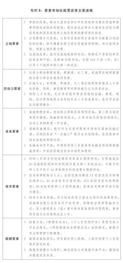 一是要素市场化配置体制机制进一步完善。深化土地计划管理方式改革,赋予省级人民政府更多自主权,启动新一轮农村宅基地制度改革试点,调整完善土地出让收入使用范围,优先支持乡村振兴。加快完善技能人才评价制度,民营企业职称评审渠道逐渐打通,区域一体化人才资格互认机制稳步推进。深化科技成果使用权、处置权和收益权改革,开展赋予科研人员职务科技成果所有权或长期使用权试点。开展公共数据资源开发利用试点,推进政务数据有序共享。制定建设高标准市场体系行动方案。