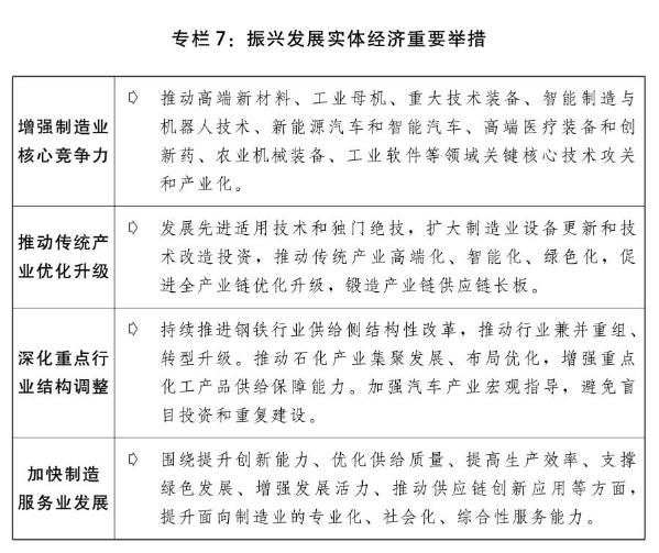 二是着力振兴和发展实体经济。实施新一轮制造业核心竞争力提升五年行动计划,开展先进制造业集群发展专项行动,创建国家制造业高质量发展试验区。对先进制造业企业按月全额退还增值税增量留抵税额,提高制造业贷款比重,扩大制造业设备更新和技术改造投资。加快重点行业结构调整和绿色化改造,持续推进国家战略性新兴产业集群发展工程,强化技术创新和公共服务。落实新时期促进集成电路产业和软件产业高质量发展的若干政策。加强产业管理,促进新能源汽车健康有序发展,加快构建智能汽车基础设施、产业生态等支撑体系。加快壮大新能源等产业,提升新能源消纳和存储能力。培育壮大生物经济,推动生物技术融合发展。加快临床急需用药和高端医疗装备开发及产业化。推动北斗大规模应用及产业化发展。稳步提升航空产业链现代化和国际化水平。继续推动先进制造业和现代服务业融合试点。依托工业互联网、工业软件等新一代信息技术,加快制造服务业发展。进一步完善废旧家电回收处理体系,畅通家电生产、消费、回收、处理全链条。实施中华老字号保护发展工程。办好2021年中国品牌日活动。