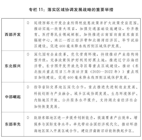 三是扎实落实区域协调发展战略。推动构建更加有效的区域协调发展新机制。研究出台西部大开发“十四五”实施方案和重点地区规划,继续实施西部大开发企业所得税优惠政策,执行新修订的《西部地区鼓励类产业目录》,推进成渝地区双城经济圈建设,打造带动全国高质量发展的重要增长极和新的动力源,提升关中平原城市群建设水平,促进西北地区与西南地区合作互动,积极推动西部大开发形成新格局。研究出台东北振兴“十四五”实施方案,着力推动东北地区产业结构调整优化,支持东北地区加大开放合作,推动东北振兴取得新突破。研究出台《关于新时代推动中部地区高质量发展的指导意见》,继续支持湖北省经济社会发展,促进中部地区加快崛起。大力推进山东新旧动能转换,支持福建高质量发展及平潭综合实验区建设,有力促进环渤海地区合作加快发展,深入推进淮河生态经济带建设,鼓励东部地区加快推进现代化。支持革命老区加快发展,贯彻落实《关于新时代支持革命老区振兴发展的意见》,促进民族地区经济社会发展,加强边境地区建设,加快推进资源型地区转型升级,支持老工业基地转型发展、承接产业转移。支持国家级新区、经济开发区、高新区创新发展。完善推进海洋经济高质量发展的政策体系,培育壮大海洋战略性新兴产业。