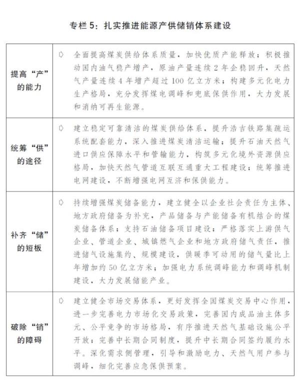 二是保障能源资源安全。继续推进能源产供储销体系建设,加强网络布局、规划建设、运行管理、调配调度等方面有机衔接。优化煤炭生产开发布局和产能结构,系统提升煤炭供应保障能力。提升电力运行水平,推进风光水火核储一体化发展,充分发挥煤电调峰、应急、支持和兜底保供作用。大力提升油气勘探开发力度,实施天然气管网互联互通工程,强化油气供应保障基础。积极推进能源通道建设,增强能源储备能力,提升运输保障能力。完善应急保障预案,提升风险应对和应急调节能力,增强能源安全韧性。继续开展找矿突破战略行动,实施矿产地储备工程,全面推进矿业权竞争性出让,积极推进“净矿出让”,调动各类市场主体积极性。加强矿产资源开发管理和保护,提升战略性矿产资源储备安全保障能力。积极参与全球矿业治理,持续开展国际矿业合作。