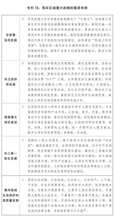 二是区域重大战略深入实施。纵深推进京津冀协同发展,积极稳妥疏解北京非首都功能,高标准高质量推进雄安新区规划建设,加快北京城市副中心建设,持续实施协同发展重大项目,加大京津冀地区城际铁路规划建设力度。扎实推进长江经济带生态环境系统性保护修复,大力实施城镇污水垃圾、化工污染、农业面源污染、船舶污染以及尾矿库治理“4+1”工程,长江流域重点水域“十年禁渔”全面启动,深入开展绿色发展试点示范,长江保护法正式出台。稳步推进粤港澳大湾区建设,加大科技创新和产业协同力度,深入推进重大合作平台建设,实施粤港澳大湾区城际铁路建设规划,基础设施和规则机制互联互通取得新进展,《深圳建设中国特色社会主义先行示范区综合改革试点实施方案(2020-2025年)》出台实施。扎实推进长三角一体化发展,推进重大平台建设和跨区域合作,积极构建协同创新网络体系,持续深化生态环境共保联治,提升基础设施互联互通水平,加快公共服务便利共享。黄河流域生态保护和高质量发展规划纲要印发实施。