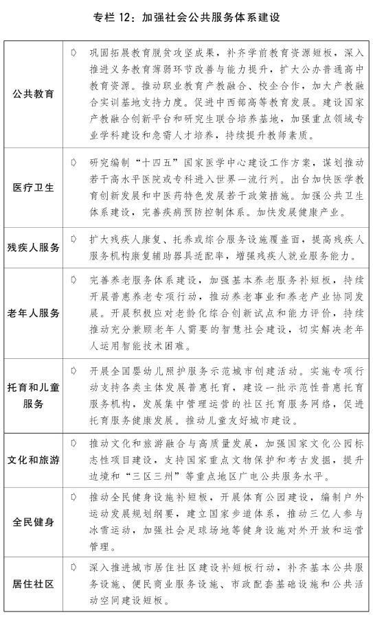 五是加强社会公共服务体系建设。推动出台“十四五”公共服务发展规划,完善均等化推进机制,推动国家基本公共服务标准落地落实。持续推进健康中国行动。启动实施优质高效医疗卫生服务体系建设工程,推进疾病预防控制体系现代化,加强心理健康服务体系建设和规范化管理,发展全方位全生命周期健康服务。推进国家医学中心建设,深入推进区域医疗中心建设试点,加快优质医疗资源扩容和均衡布局。启动实施医疗保障服务示范工程,推动医疗保障公共服务标准化、规范化、精细化。建立健全农村医疗卫生服务网络和城市社区卫生服务网络,提高医疗保障水平。坚持中西医并重,实施中医药振兴发展重大工程。实施积极应对人口老龄化国家战略,增强生育政策包容性,着力降低生育、养育、教育成本。发展普惠型养老服务和互助性养老,构建居家社区机构相协调、医养康养相结合的养老服务体系,健全养老服务综合监管制度,加快推进养老产业发展,统筹推进农村养老服务发展。发展普惠托育服务体系。深化家政服务业“领跑者”行动,培育员工制家政企业,推动家政进社区。推进长城、大运河、长征、黄河等国家文化公园建设,着力打造中华文化重要标志。实施文化保护传承利用工程,加强重要文化遗产和国家公园等重要自然遗产保护利用,推进故宫博物院北院区、国家美术馆等重大文化设施项目建设。繁荣发展哲学社会科学。促进文化和旅游融合发展,培育世界级旅游景区和度假区、国家级休闲城市和街区。出台实施国民休闲纲要(2021-2035年),推动落实带薪休假制度。深入推进北京冬奥会、冬残奥会筹办工作。制定构建更高水平的全民健身服务体系的意见,打造贴近自然、便捷高效的群众健身场地。开展社会服务设施兜底线工程,支持儿童福利设施、残疾人康复和托养设施建设,进一步补上退役军人等领域基础设施短板,提升兜底保障能力。加强和创新社会治理,健全城乡社区治理和服务体系。深化公共法律服务体系建设。完善和落实安全生产责任制,加强安全生产监管执法。强化生物安全保护,加强国家生物数据中心体系和高级别生物安全实验室建设,提高食品药品安全保障水平,加强网络食品安全监督管理,启动建设食品安全风险评估与标准研制重点实验室。加强应急救援力量建设,提高防灾减灾抗灾救灾能力,切实做好洪涝干旱、森林草原火灾、地质灾害、地震等防御和气象服务。