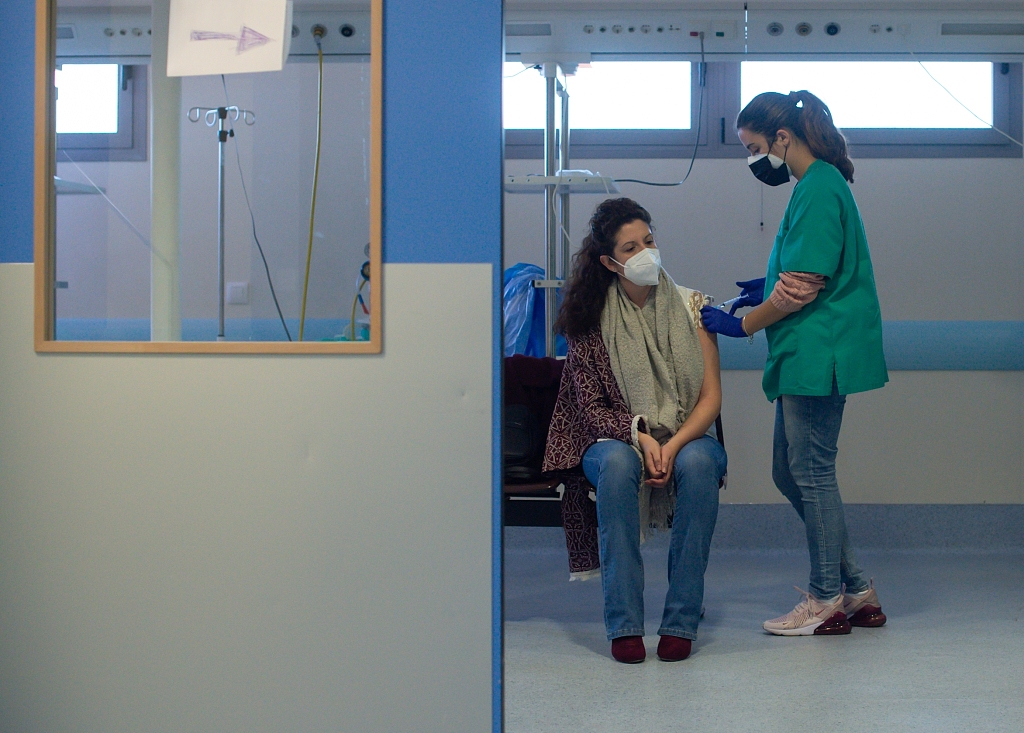 图为当地时间3月12日,西班牙卡塞雷斯省,医务人员在为人们接种阿斯利康疫苗。图片来源:视觉中国