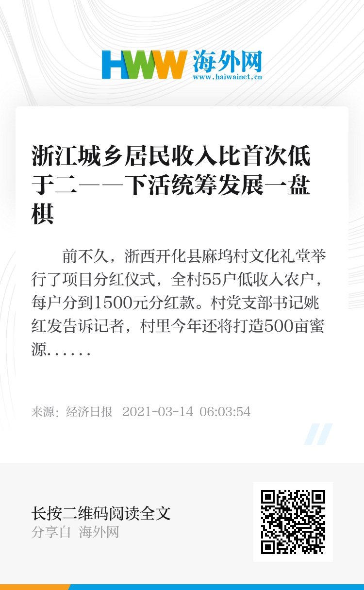 麻坞村越过越甜的日子,是浙江农村发展的缩影。不久前,浙江省政府宣布:2020年全省城镇居民、农村居民人均可支配收入分别为62699元、31930元,城乡居民收入比降至1.96∶1,自1993年以来首次低于2。