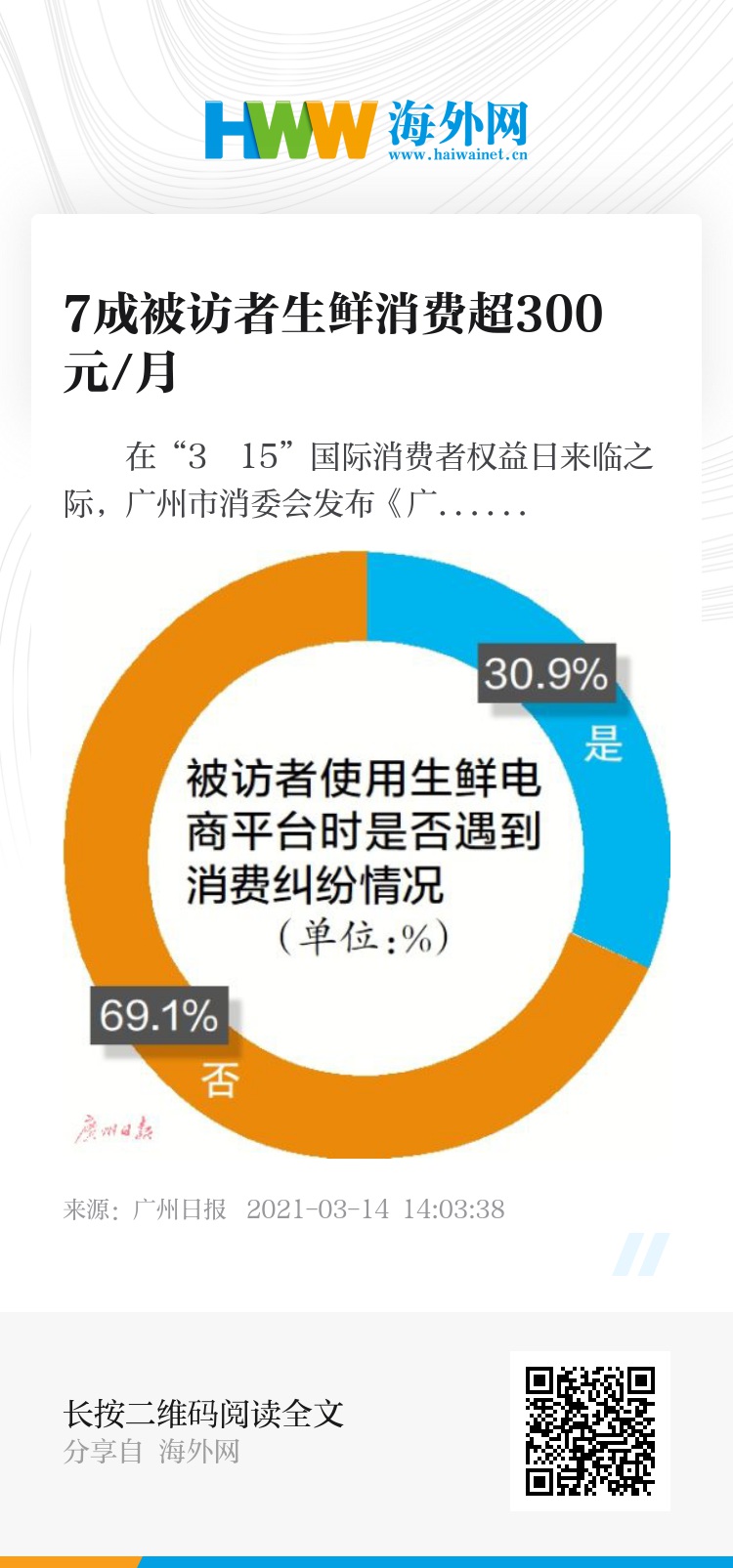 在“3・15”国际消费者权益日来临之际,广州市消委会发布《广州生鲜电商消费现状调查报告》显示,被访者对广州生鲜电商的总体满意度评价总得分为83.0分,但有超过3成被访者遇到纠纷,“商品损坏”“商品遗漏”“商品短斤缺两”的纠纷占比较高。在调查中,仅28.3%的调查订单做到“疫情期间提供无接触配送”。